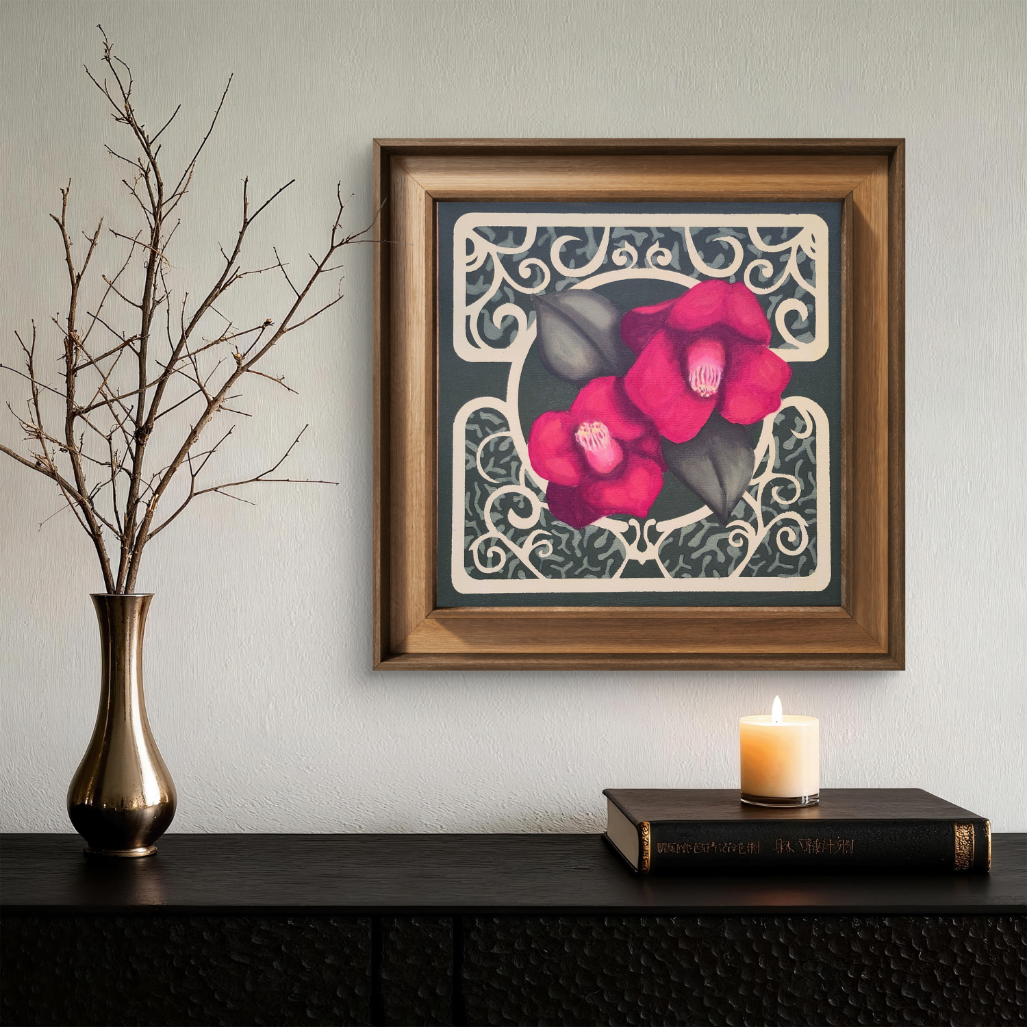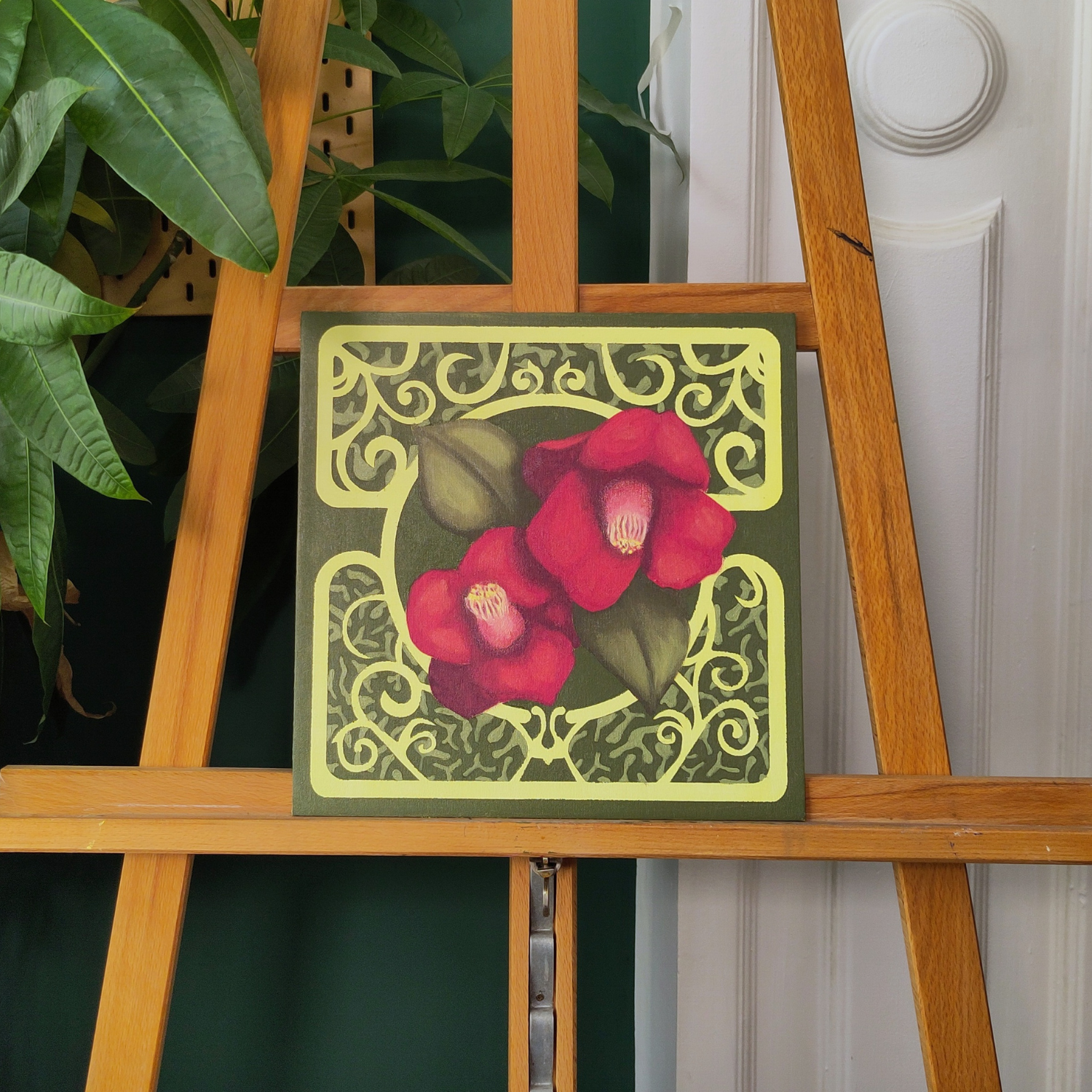 Esta pintura nació de un encuentro primaveral con las camelias japónicas en los jardines de Tokio. Inspirada en el Art Nouveau, la obra invierte la lógica decorativa del movimiento: aquí, la flor no es ornamento sino protagonista absoluta. El rojo carmesí intenso de la camelia vibra sobre un fondo verde complementario, creando una tensión cromática que invita a la contemplación. Una celebración del color y la forma orgánica, capturada en óleo con delicadeza y atención al detalle.