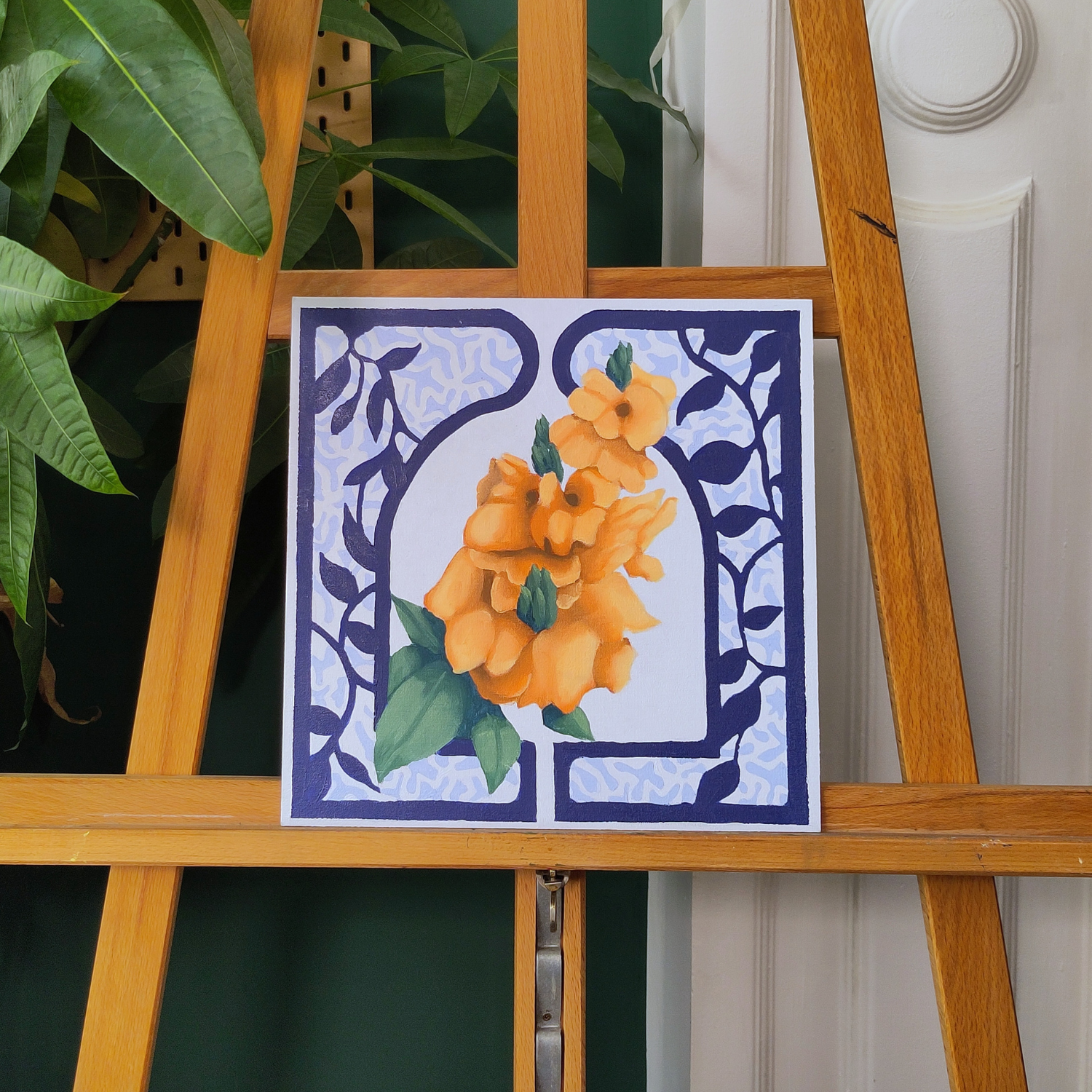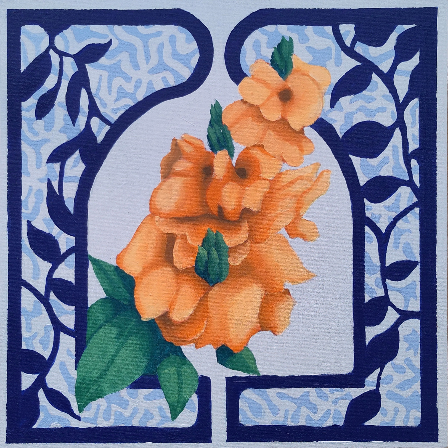 Esta obra cierra la serie de flores Art Nouveau con una celebración de lo cercano. La crossandra, con sus ramilletes en forma de espiga, presenta un desafío pictórico único: capturar la aleatoriedad y el desorden orgánico de pétalos que se agrupan sin seguir reglas aparentes. Aquí la belleza no está en la flor individual, sino en el cúmulo vibrante que se admira como un todo. Una pieza que recuerda que la inspiración no siempre está lejos, a veces basta con mirar el propio balcón con nuevos ojos.
